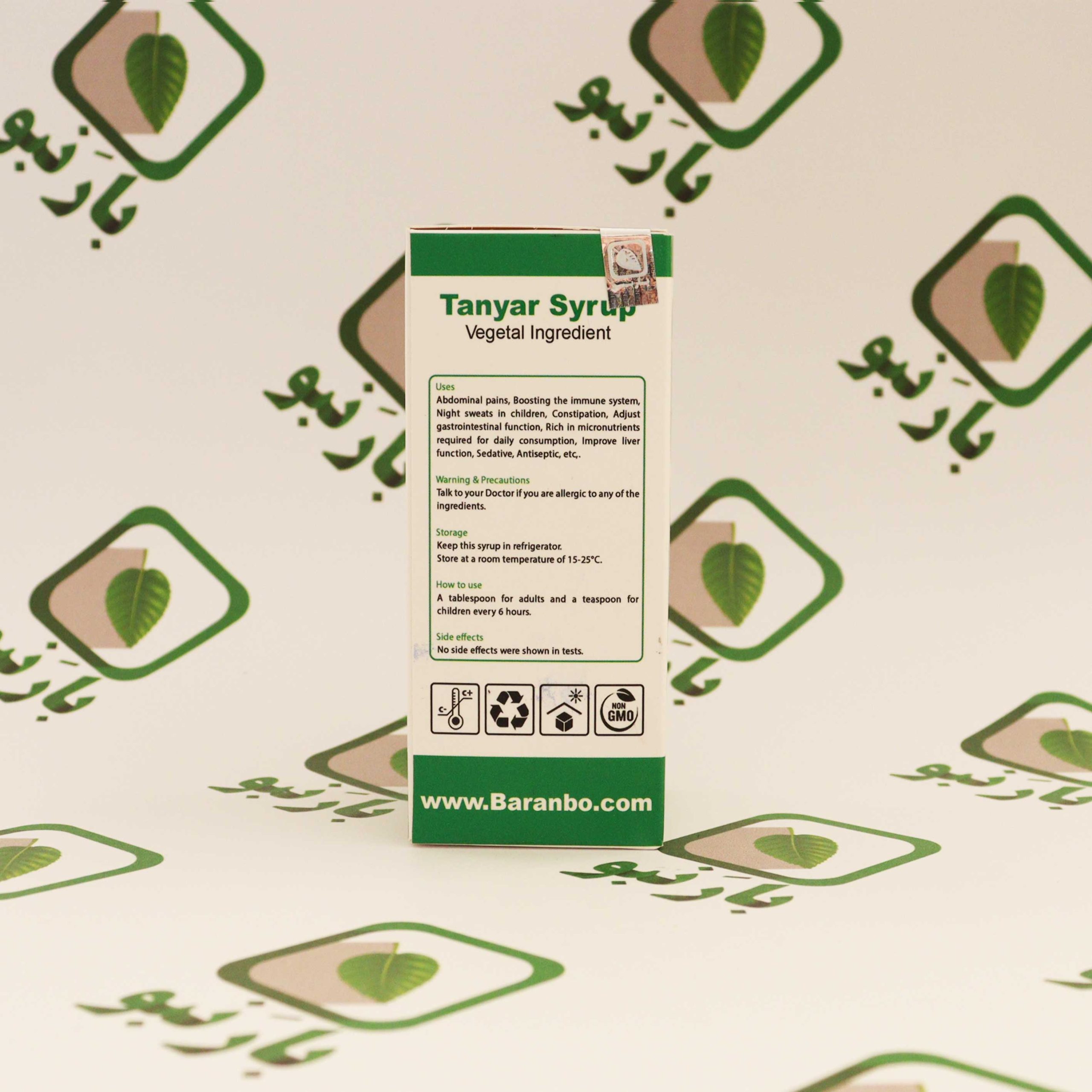 - شربت تَنیار Tanyar Syrup مولتی ویتامین طبیعی Vegetal Ingredient محصول پیش روی شما یک شربت کاملاً طبیعی و ویژه است که به تعریف طب رایج فعلی، سرشار از ویتامین های مورد نیاز افراد به خصوص کودکان در حال رشد می باشد و می توانیم آن را یک مولتی ویتامین کاملاً ارگانیک بنامیم. این محصول دارای ویژگی های بی نظیری است که به قسمتی از آن اشاره می کنیم: ضد دل پیچه و دل درد، تقویت کننده سیستم ایمنی، ضد تعرق شبانه کودکان، ضد یبوست، تنظیم کارکرد دستگاه گوارش، موثر در رشد و سلامت جسمی و روحی، سرشار از ریز مغذی های مورد نیاز مصرف روزانه، مقوی کبد، شادیآور، عامل تقویت اندام های رئیسه (مغز، قلب، کبد)، آرامشبخش، ضد عفونت و... این موارد تنها بخشی از خواص این شربت می باشد و با توجه به ترکیبات و فرمول خاص این محصول، یک شربت ویژه می باشد که نظیر آن به ندرت پیدا میشود. طریقه مصرف: نوزادان از سن ۶ ماهگی تا ۲ سالگی: هر ۶ ساعت یک قاشق چایخوری. کودکان از ۲ سالگی تا ۷ سالگی: هر ۶ ساعت یک قاشق مرباخوری. برای سایر سنین: هر شش ساعت یک قاشق غذاخوری. عوارض: تاکنون هیچ گونه عوارضی از مصرف این فرآورده چه در آزمایشگاه و چه در تست های بالینی گزارش نشده است و با توجه به فرمول حکیمانه و تدبیر شده آن، هیچگونه عوارض جانبی ندارد. منع مصرف: ندارد. در صورت دلخواه می توانید با عرق بیدمشک، به صورت شربت رقیق در آورید و بعد استفاده نمایید. برای سهولت مصرف در کودکان زیر دو سال میتوانید رقیق شده ی تنیار را در شیشه شیر فرزندتان بریزید و سپس مصرف کند. ترکیبات: سپ، گزر، لیموترش، جعفری، گیلدیک، خوب گلان، زعفران، اکلیل الملوک، شبت، بذر شبت قرمز، تین، سکج، چکوک، بادام، خس، ویولا، جو، حنط، گل سرخ، گرده گل، تبر خون، انگبین، شیره و... . شرایط نگهداری: در جای خشک و خنک دور از نور خورشید و در دمای کمتر از ۳۰ درجه سانتی گراد نگهداری و از یخ زدگی محافظت شود.وزن این محصول با بسته بندی حدود 250گرم میباشد.