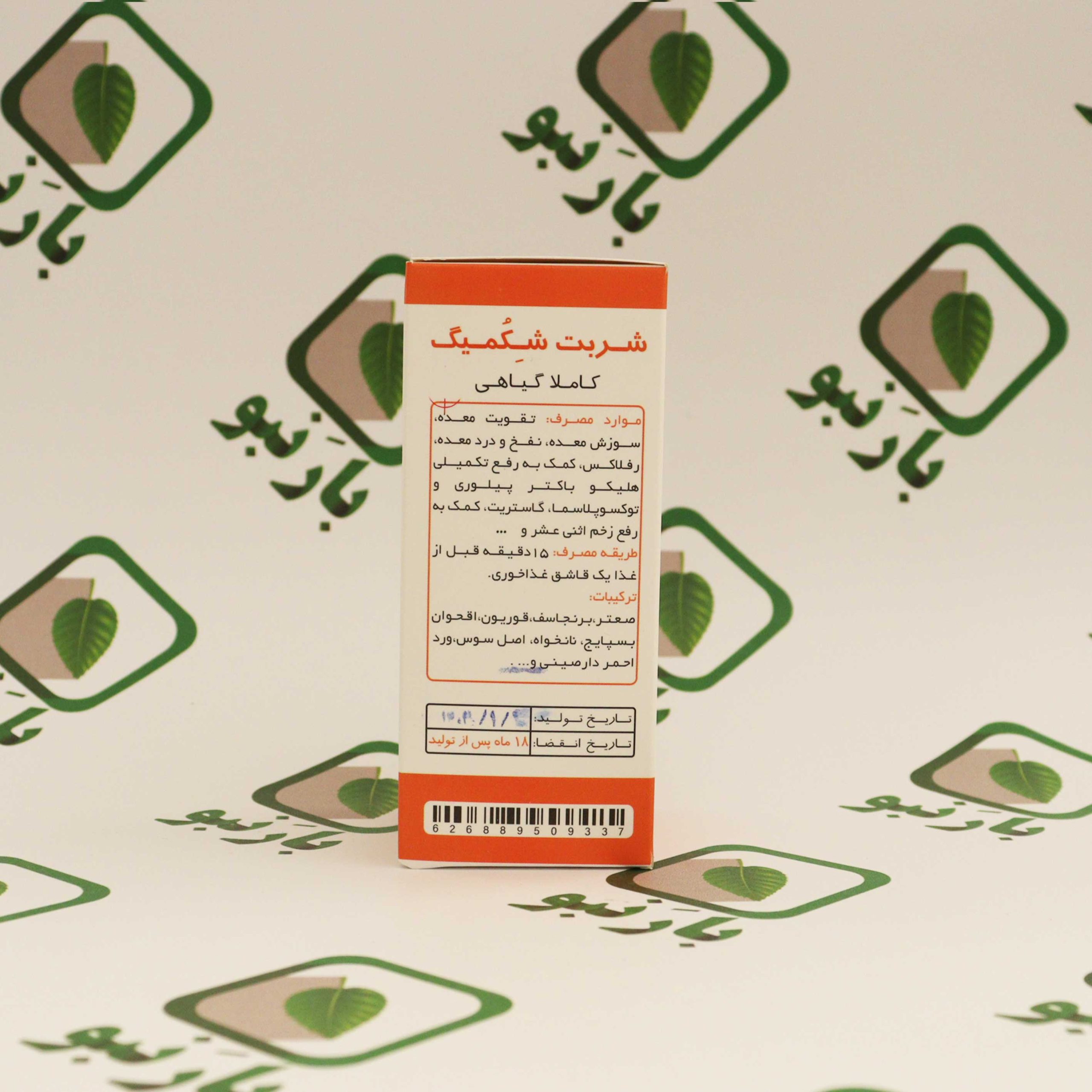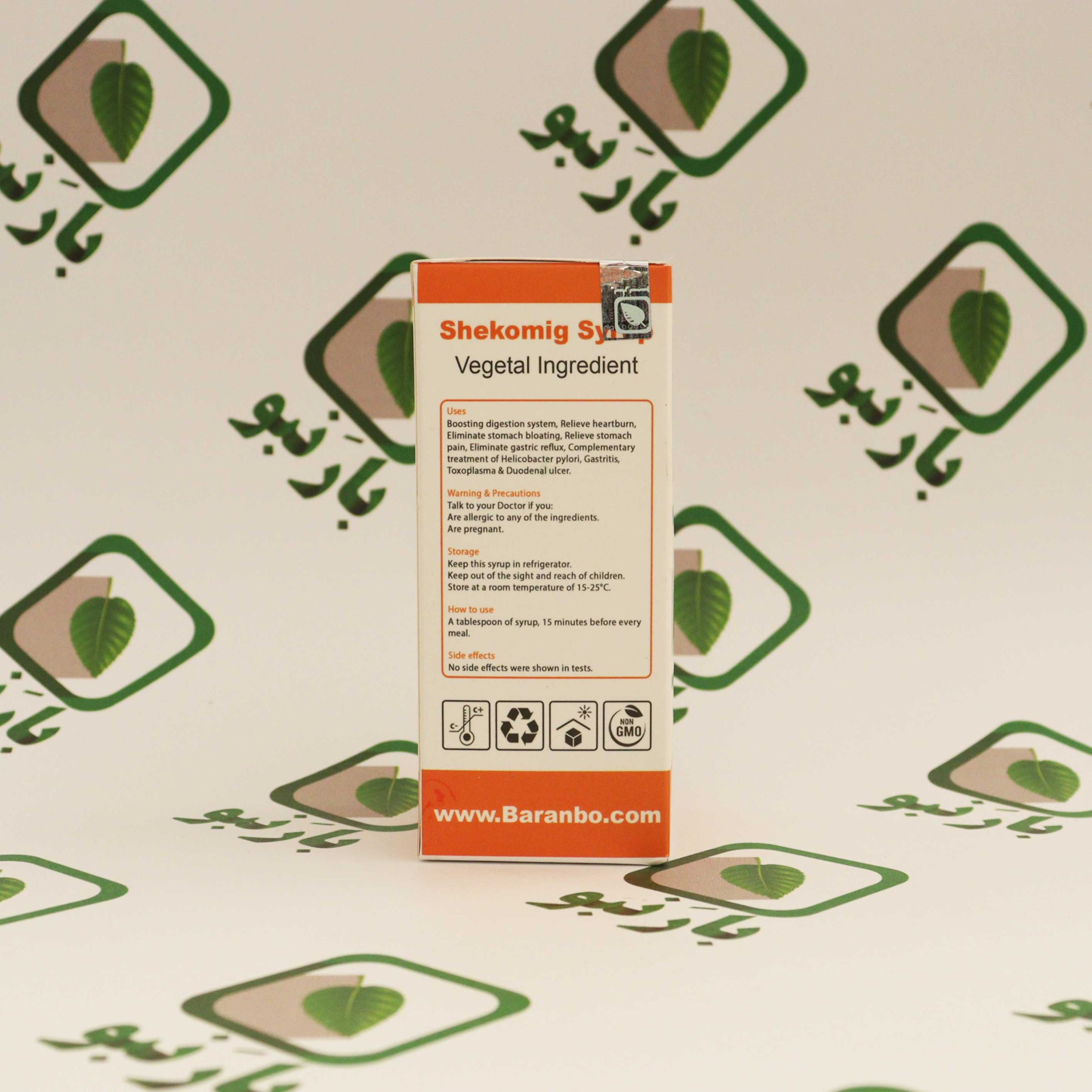 - شربت شِکُمیگ Shekomig Syrup تقویت معده Vegetal Ingredient خواص: از ویژگی های این محصول می توان به تقویت معده و روده ها، رفع دل درد و کمک به رفع انگل، کمک به بهبود گاستریت و زخم اثنی عشر، ضد نفخ، ضد رفلاکس معده و کمک به بهبود آن، بهبود فرایند هضم و جذب مواد غذایی، رفع استرخا دریچه پیلور، کمک به رفع کولیت های روده، رفع یبوست و گاز روده اشاره کرد. نکته: توصیه میشود برای جوابدهی بهتر، این محصول را همراه ترکیب گیاهی معده مصرف کنید. طریقه مصرف: ۱۵ دقیقه قبل از غذا، یک قاشق غذاخوری میل کنید. منع مصرف: کودکان زیر دوسال. عوارض: تاکنون هیچ گونه عوارضی از مصرف این فرآورده چه در آزمایشگاه و چه در تست های بالینی گزارش نشده است و با توجه به فرمول حکیمانه و تدبیر شده آن، هیچگونه عوارض جانبی ندارد. شرایط نگهداری: در جای خشک و خنک دور از نور خورشید و در دمای کمتر از ۳۰ درجه سانتی گراد نگهداری و از یخ زدگی محافظت شود. ترکیبات: صعتر، قوریون، نانخواه، برنجاسف، اقحوان، بسپایج، اصل سوس، ورد احمر، دارصینی، انگبین و... نکته: به کیسه ای که غذا پس از بلع به آن وارد می شود به پارسی «شکم» گفته می شود و در زبان پارسی میانه (پهلوی) به «کمیگ» شناخته میشده. بارنبو با ترکیب لغت شکم و شکمیگ این ترکیب را شِکُمیگ نام گذاری نمود. با انجام این موارد می توانید به رفع عوارض مشکلات دستگاه گوارش کمک شایانی کنید: ۱-قبل و بعد از غذا کمی نمک طبیعی مزه مزه کنید. ۲-غذاهای خام و پخته را باهم میل نکنید. به طور مثال مصرف انواع سالاد با غذا ممنوع است. ۳-از مصرف نوشیدنی حین غذا پرهیز کنید. ۴-درهم خوری نکنید. ۵-برهم خوری نکنید. ۶-حتماً و حتماً خوب غذا را بجوید. غذا باید کاملا له و خورد شود و حتماً با بزاق کاملا مخلوط شود و سپس بلعیده شود. ۷-روی زمین غذا بخورید. ۸-تا گرسنه نشده اید غذا نخورید. ۹-قبل از سیری کامل دست از غذا بکشید. ۱۰-بین غذا و خواب حداقل ۳ ساعت فاصله بگذارید. این محصول حدود 180گرم و با بسته بندی حدود 250 گرم میباشد